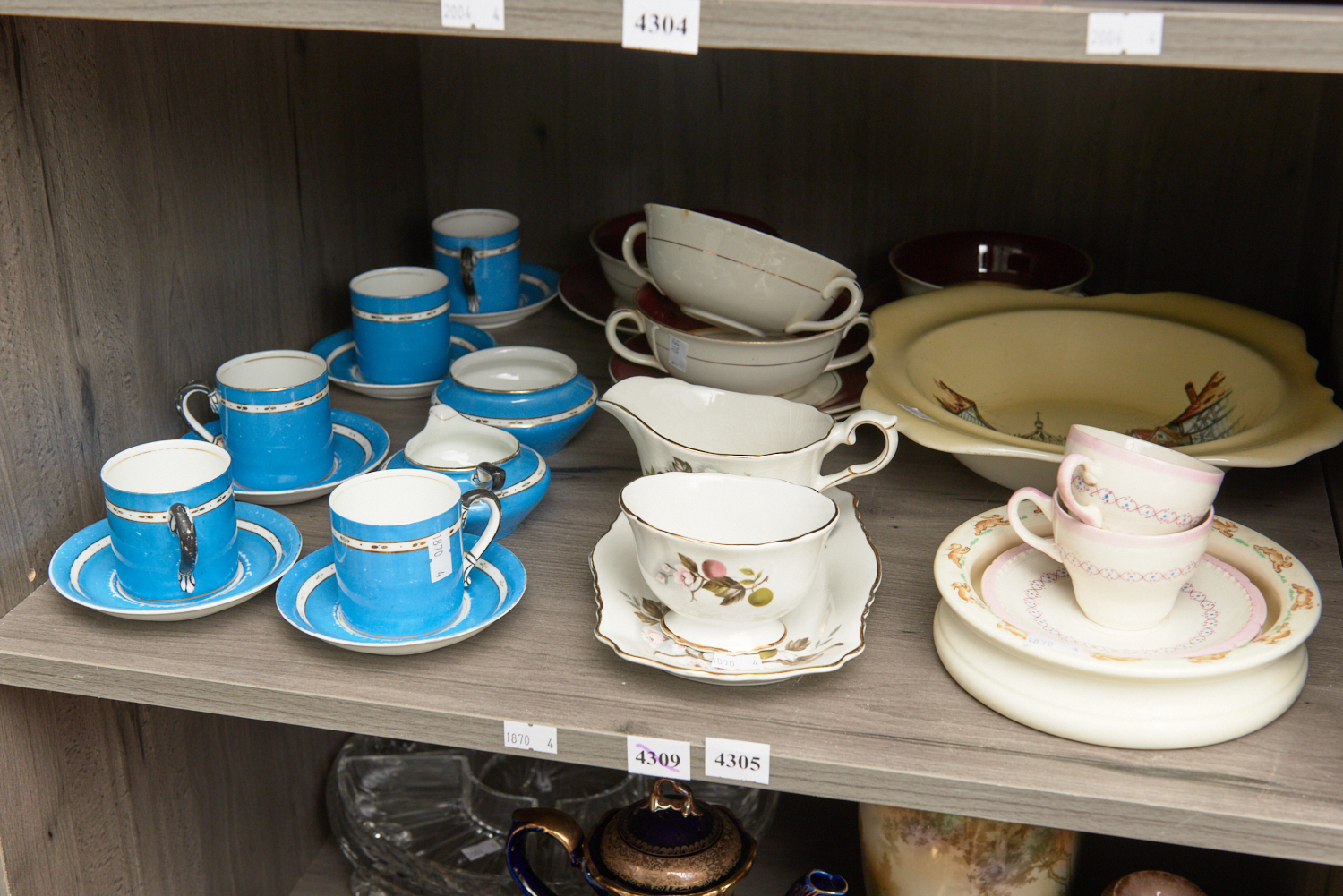 A SHELF OF ASSORTED CHINA INCLUDING DUCHESS CHINA DEMITASSE, BUNNYKINS BOWL, AND SOUP BOWLS