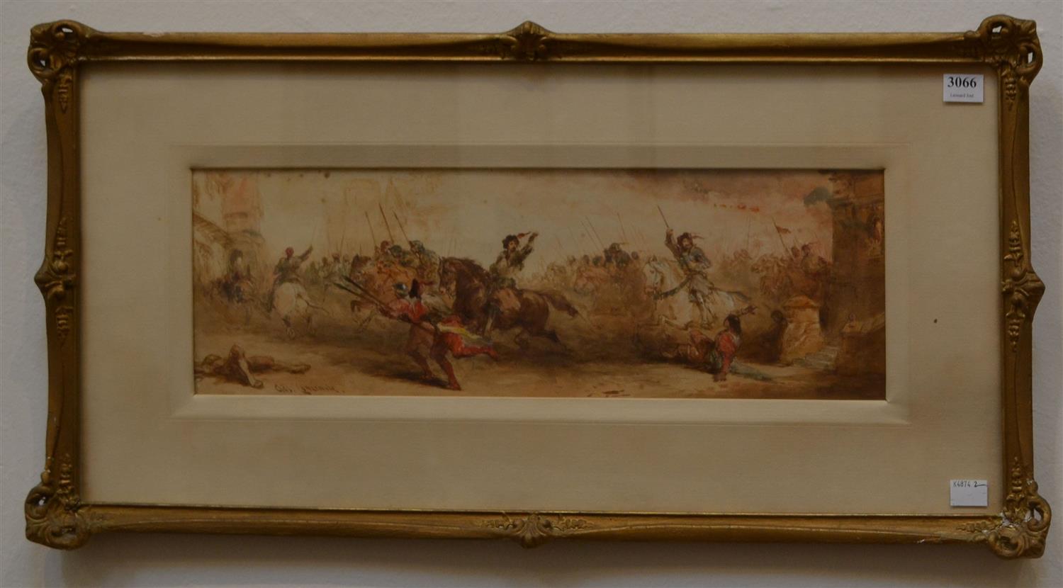 CHARLES CATTERMOLE, STORMING THE CITADEL, WATERCOLOUR, 14.5 X 44CM, FRAME SIZE: 33 X 65CM, CONDITION: FOXING, DISCOLOURATION, CONSISTENT WITH AGE