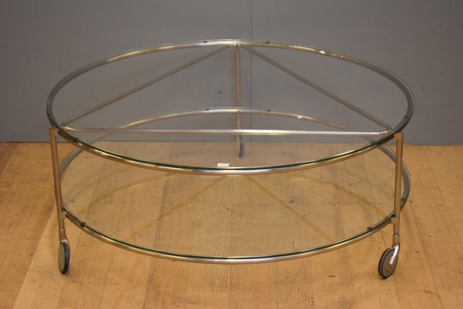 A CONTEMPORARY STAINLESS STEEL COFFEE TABLE WITH TWO TIERS OF GLASS (40H X 100D CM)