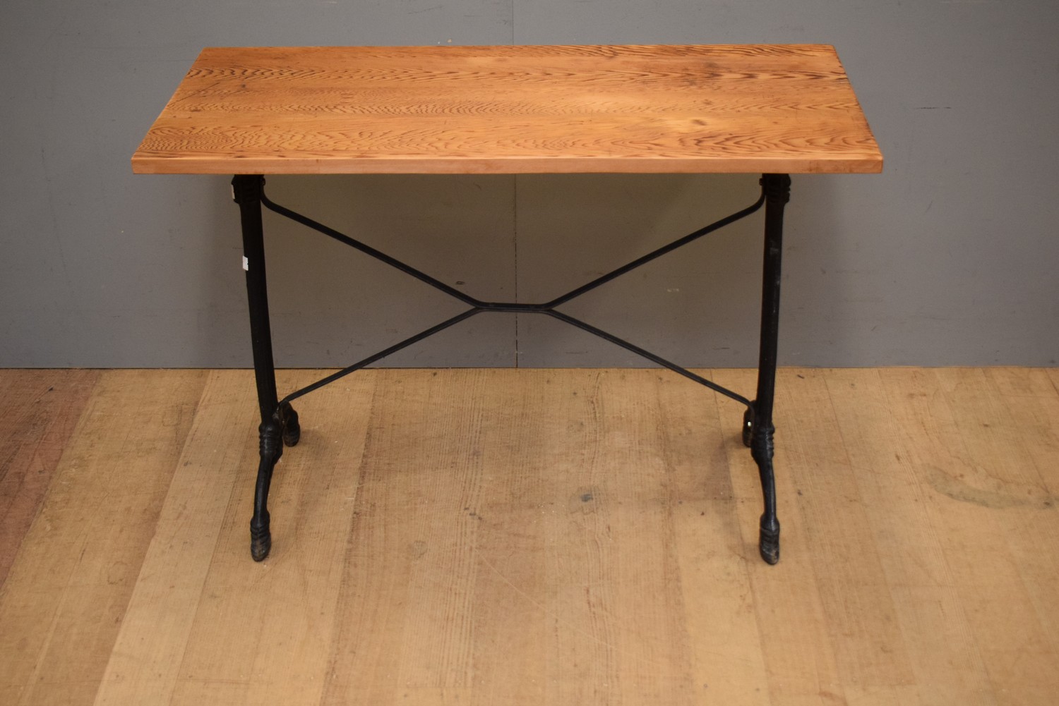 A CAST IRON BASED TIMBER TOP SIDE TABLE (71H X 103W X 50D CM)