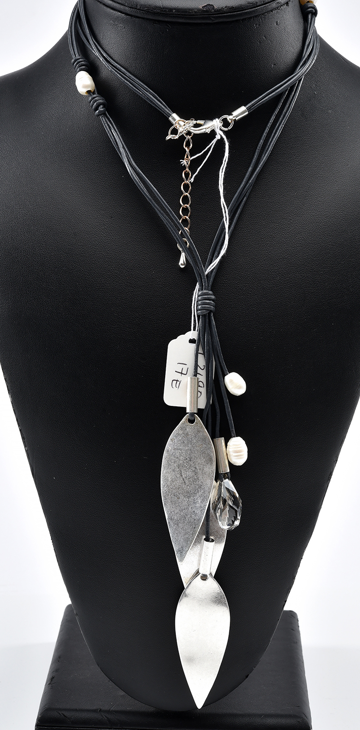 A LONG COSTUME NECKLACE WITH LEAF MOTIF AND FRESHWATER PEARLS