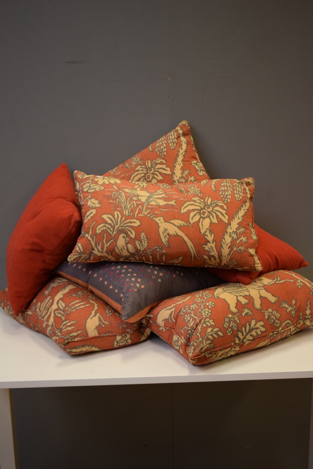 A COLLECTION OF ASSORTED CUSHIONS (LARGEST 60W X 30D CM)