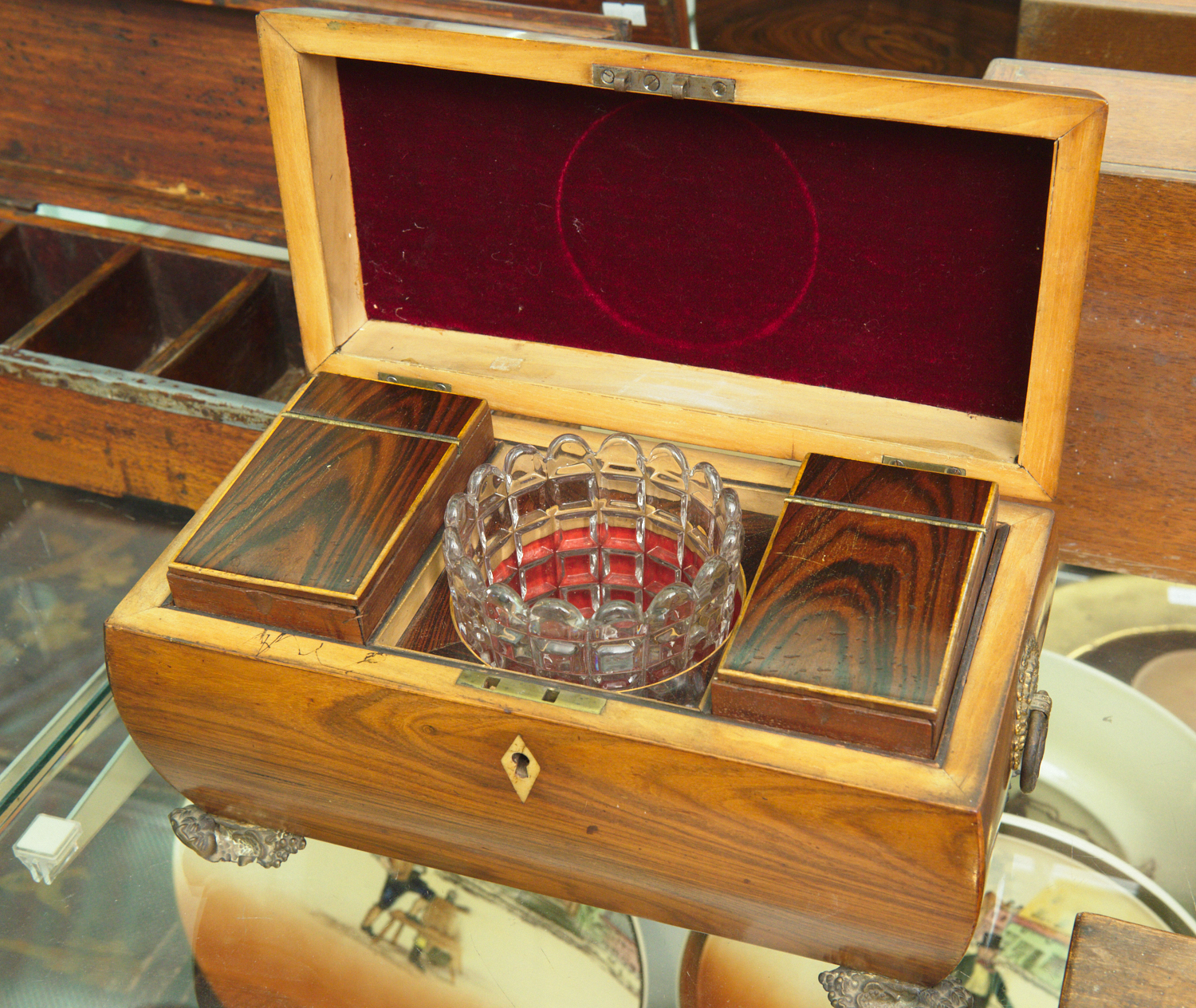 A 19TH CENTURY ROSEWOOD TEA CADDY WITH CANNISTERS (VENEER LOSS TO LID) 30 X 15 X 18CM