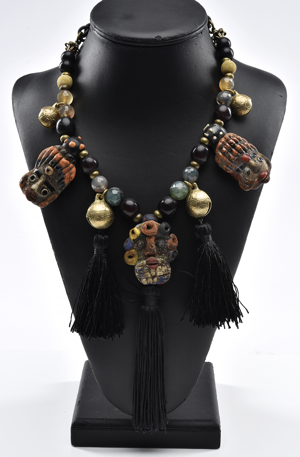 A TRIBAL NECKLACE SET WITH INDONESIAN CARVED GLASS MOTIFS, GLASS BEADS AND TASSLE, DESIGNED BY VICTOR ALEXANDRE (UN-SIGNED)