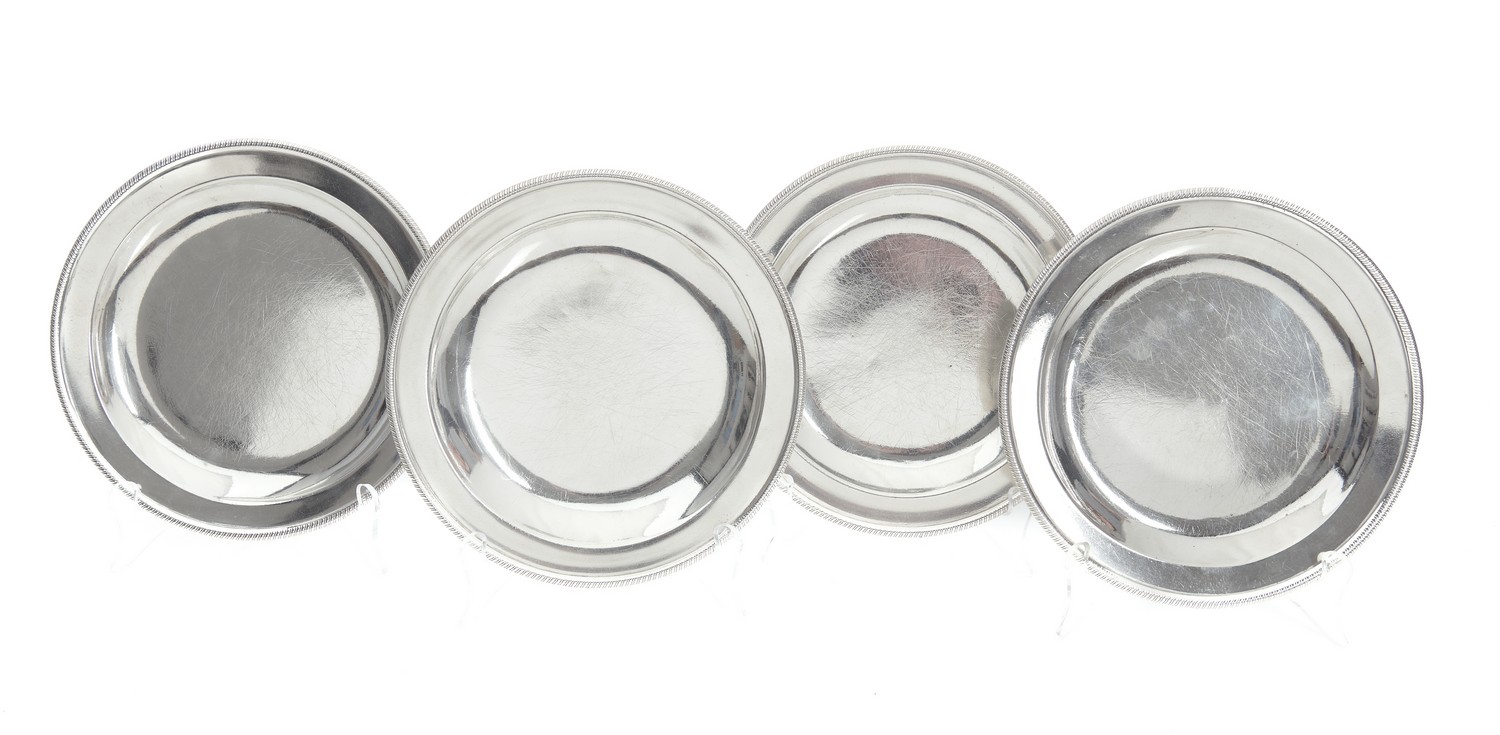 FOUR RARE GEORGE III STERLING SILVER BREAD AND BUTTER DISHES, BY THOMAS HAYTER & GEORGE SMITH, LONDON, CIRCA 1803-1807