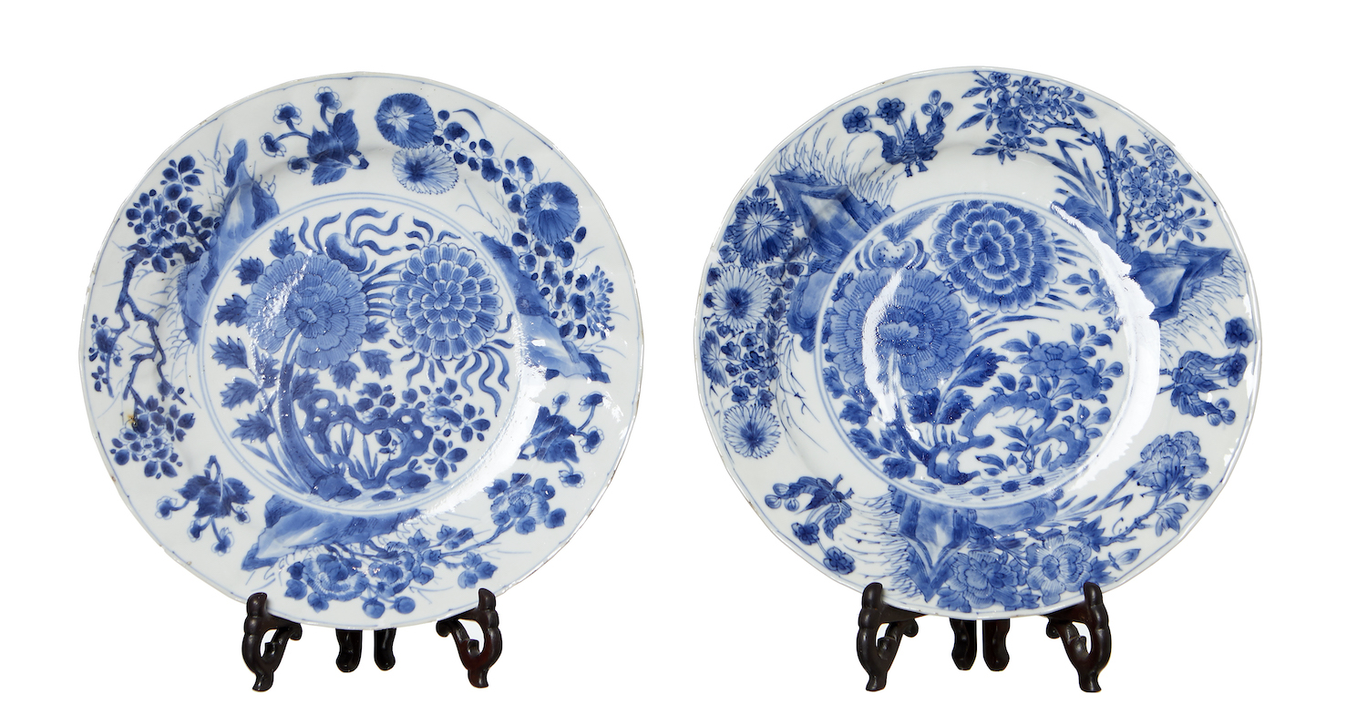 With moulded and flared rims and central medallions of peonies and a bird and foliate borders.