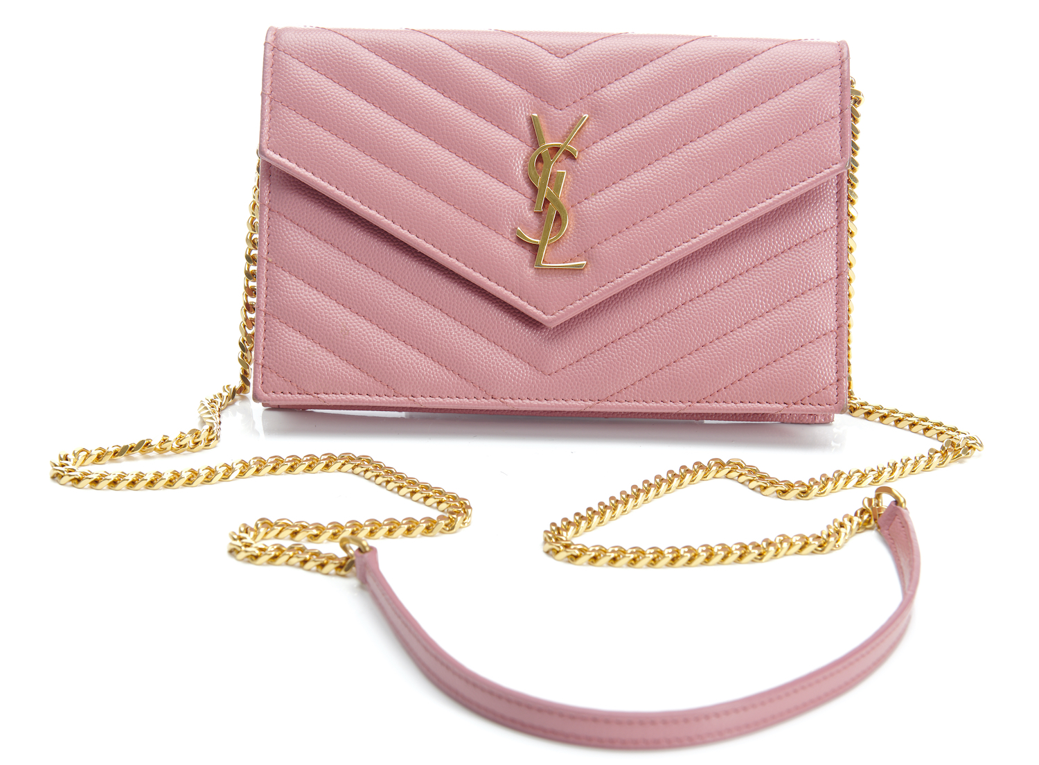 Styled in pale pink leather with gold metal hardware, 12.5 x 19 x 2.5cm.