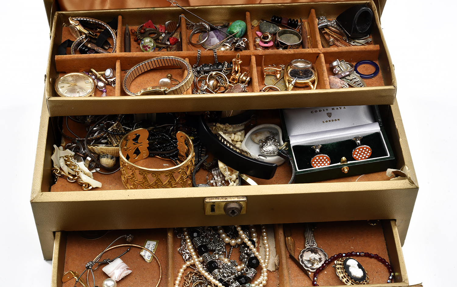 A BOX OF JEWELLERY INCLUDING INCLUDING A PAIR OF CODIS MAYA, LONDON CUFFLINKS & MMA USA OPEN-WORK BANGLE, A/F