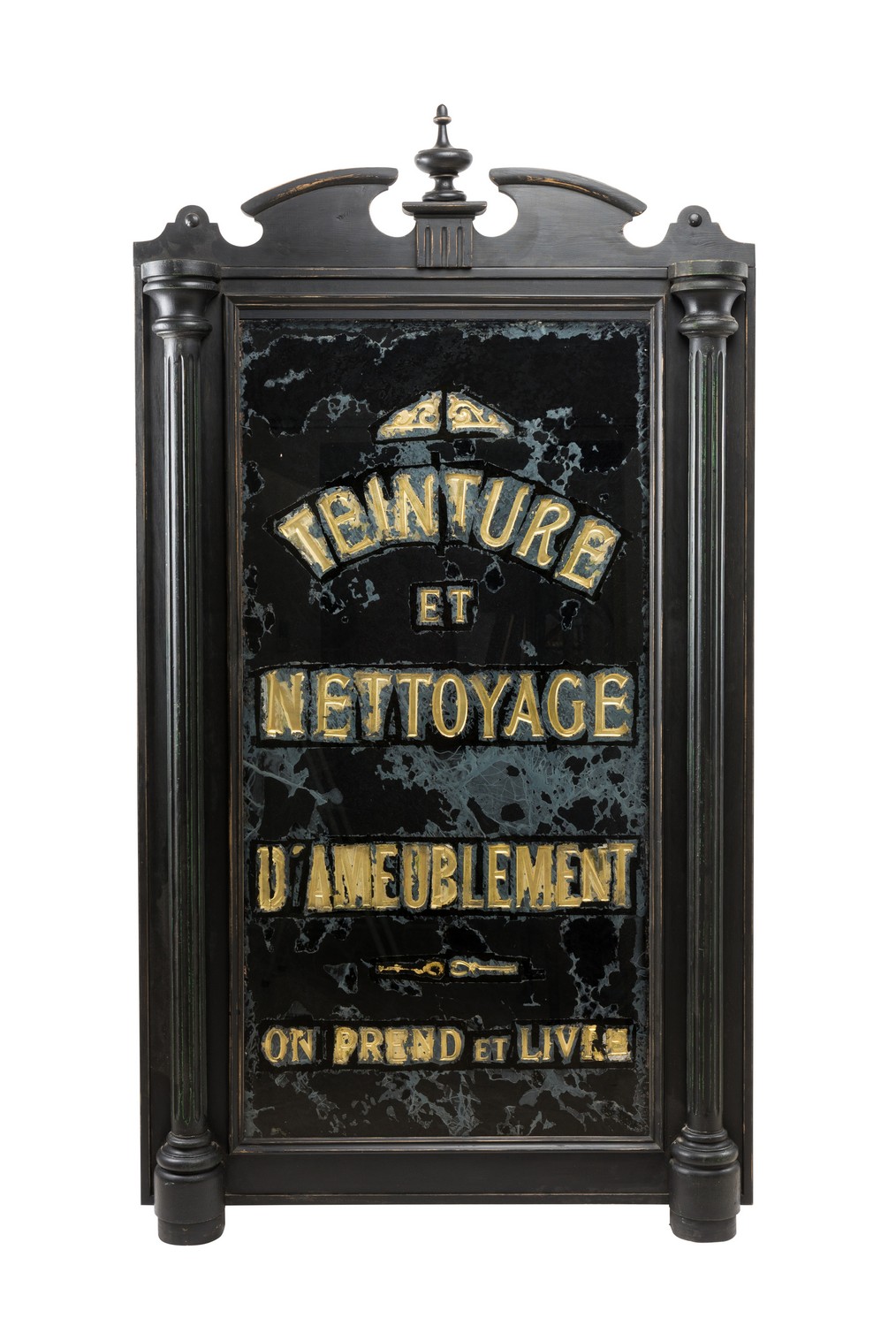 The large sign, reverse painted in black and gold. Originally a sign from a Paris based laundry