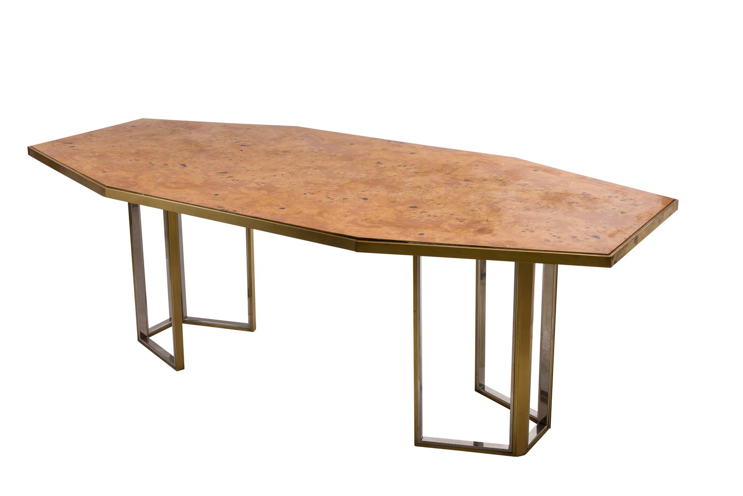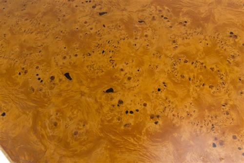 The faceted burr walut veneered table top set into a stylish brass and chrome base.