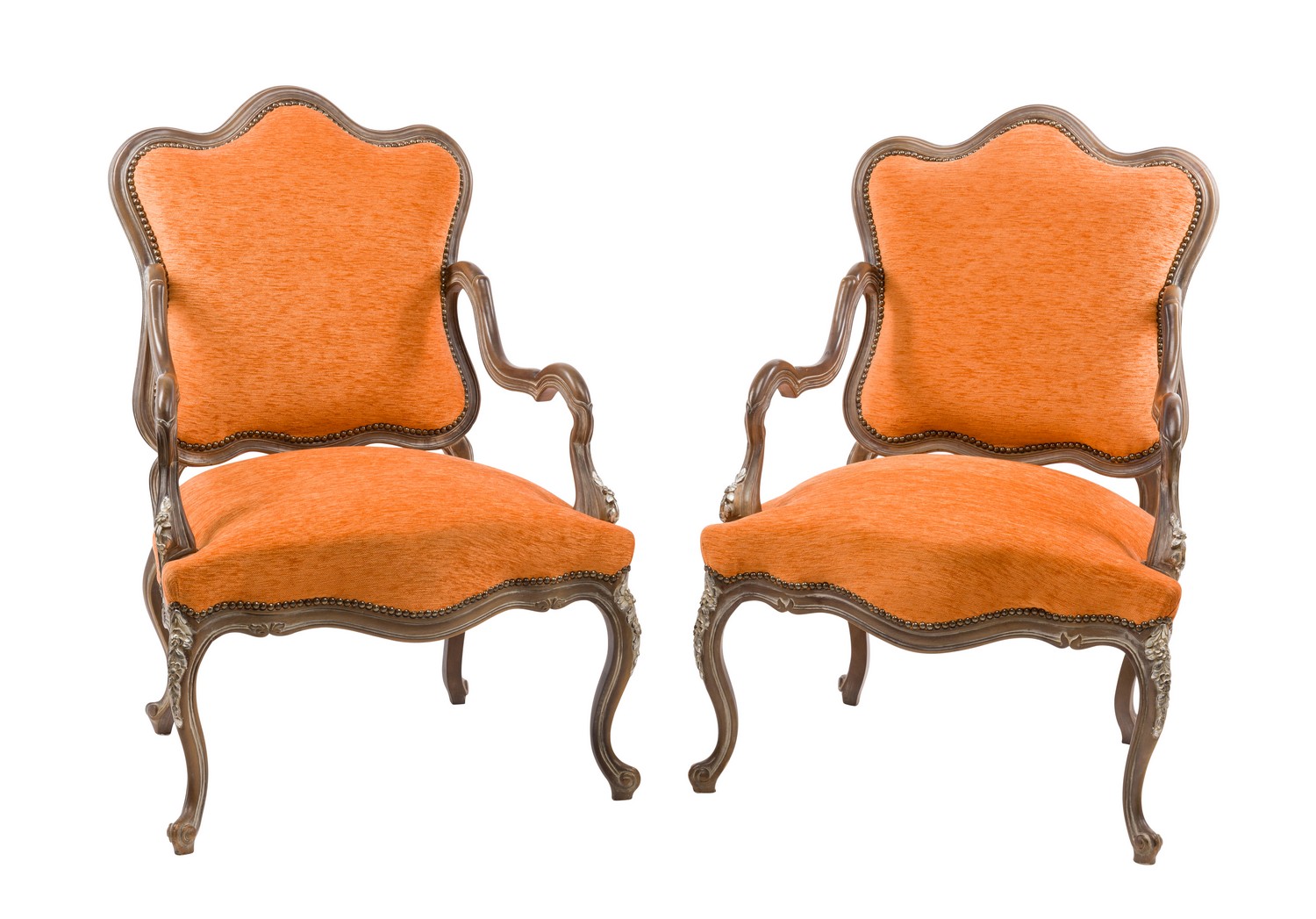 With shaped back supports and covered in a pale peach upholstery