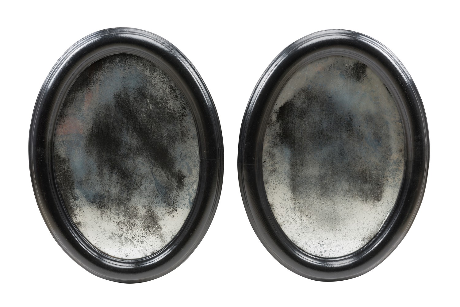 A PAIR OF DECORATIVE OVAL MIRRORS WITH DISTRESSED MIRROR PLATE