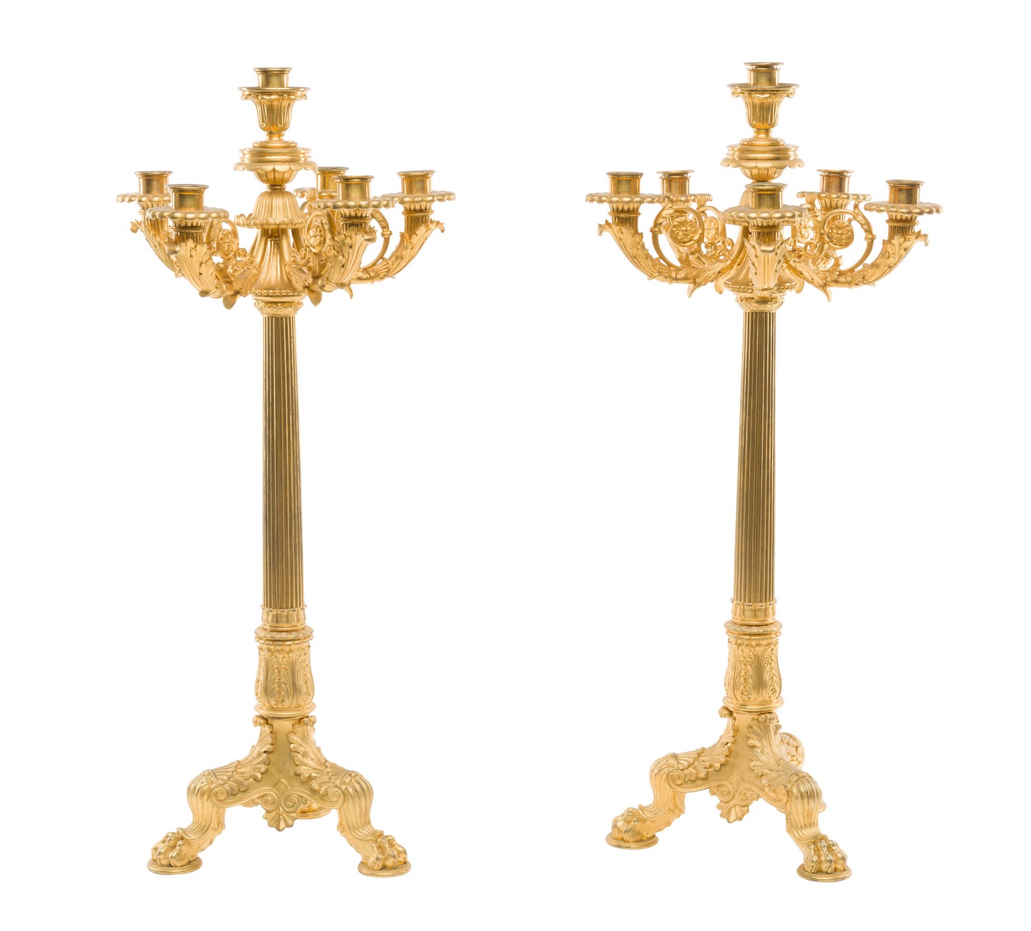 overall condition good. both candelabrum appear to have been re-gilded at some stage, with wear in places- particularly the paw feet, wax catches and central stems. one arm moves slightly- potentially loosening from body.