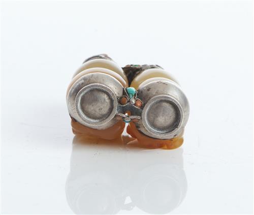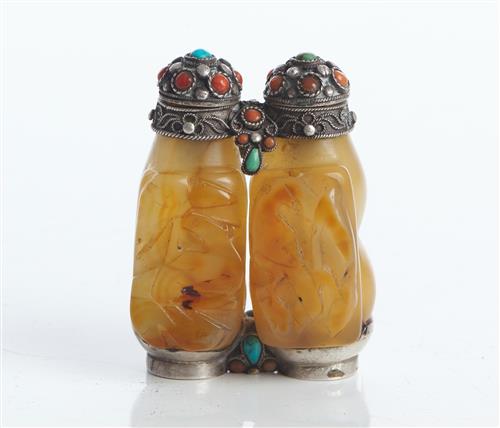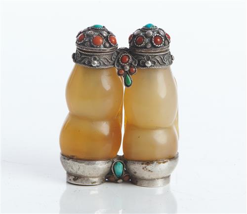 Formed from two carved hardstone double gourd-shaped snuff bottles with relief decoration to the front, joined by a turquoise and coral inlaid silver mount.