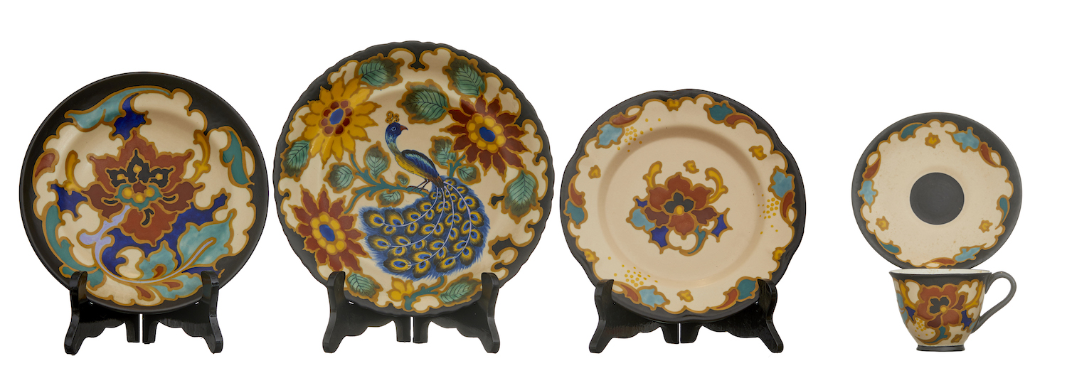 A wall plaque decorated with a central stylised peacock with a surround of flowers, signed 'Regina, WB' and numbered 1184, diameter 24cm. Another smaller with floral decoration signed 'Rosario' and numbered 471, diameter 21cm. And a cup, saucer and plate of traditional foliate design with a dark border, signed 'Rosario' and numbered 1210 and 1080.