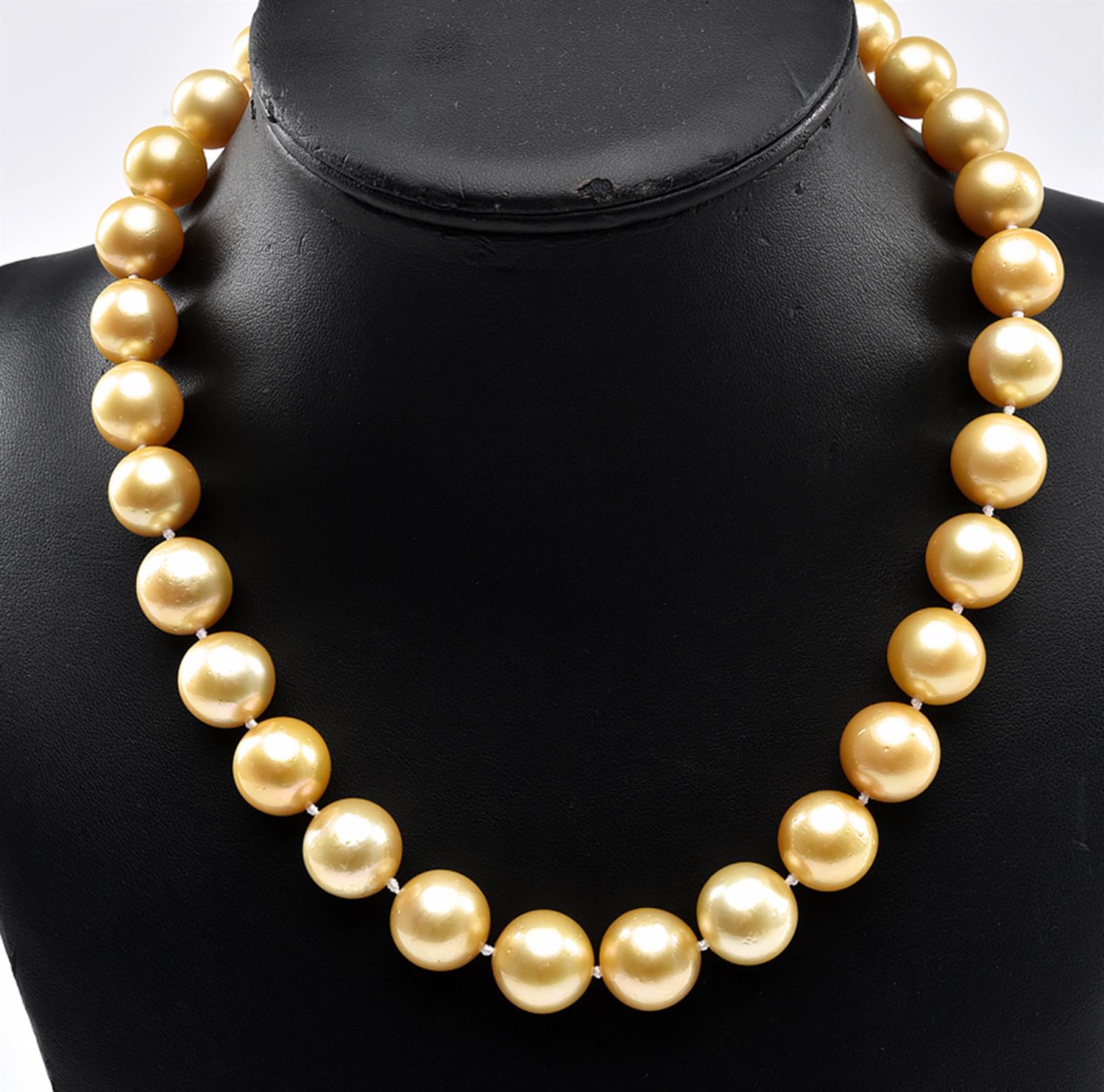 A STRAND OF GOLDEN SOUTH SEA PEARLS MEASURING 12.8MM TO 14.0MM TO A BALL CLASP IN 18CT GOLD, TOTAL LENGTH 480MM
