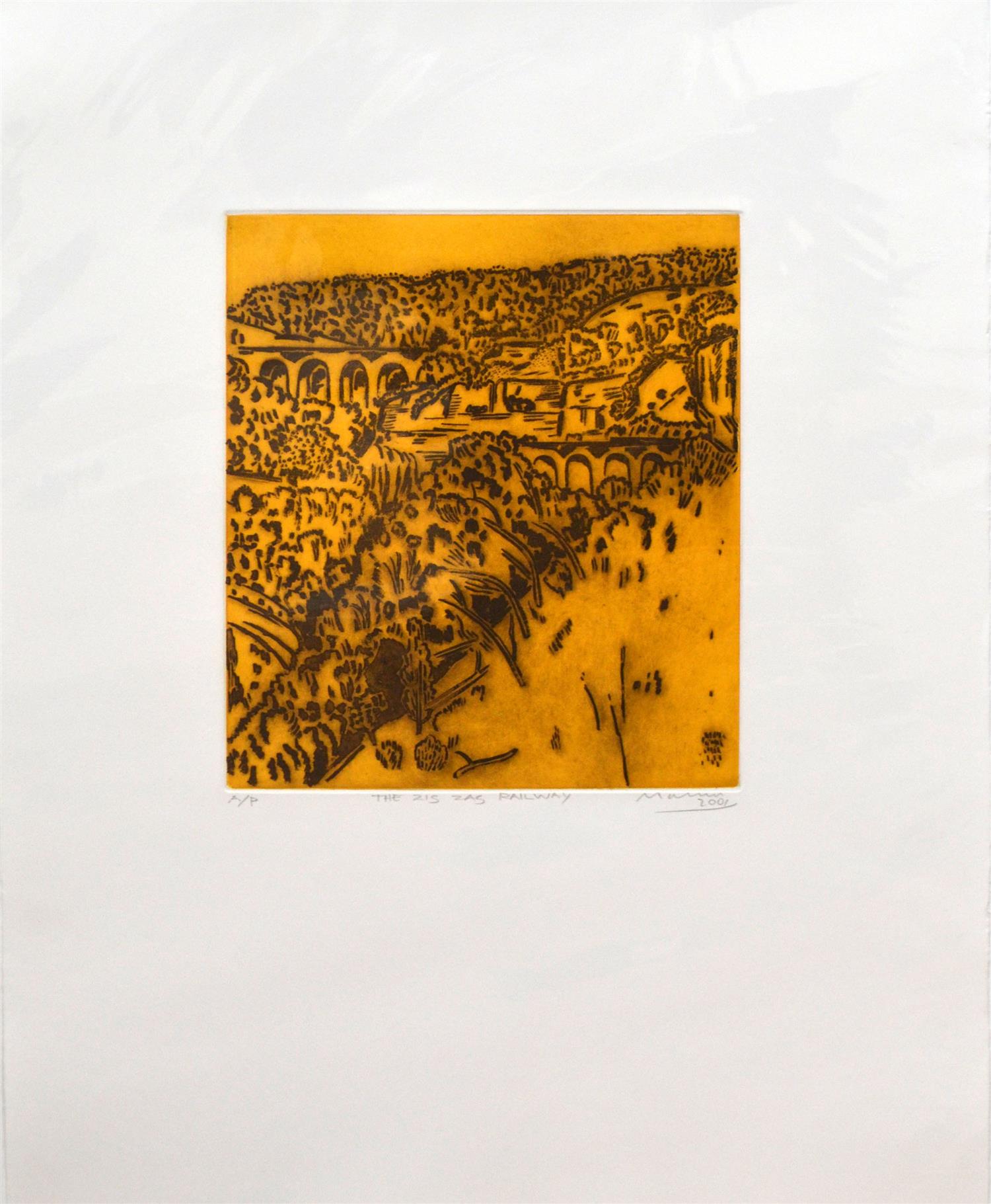 JEFF MAKIN, THE ZIG ZAG RAILWAY 2001, ETCHING A/P, 76 X 56CM (SHEET SIZE), CONDITION: VERY GOOD, UNFRAMED, HOWEVER BACKED AND WRAPPED IN PLASTIC FOR PROTECTION