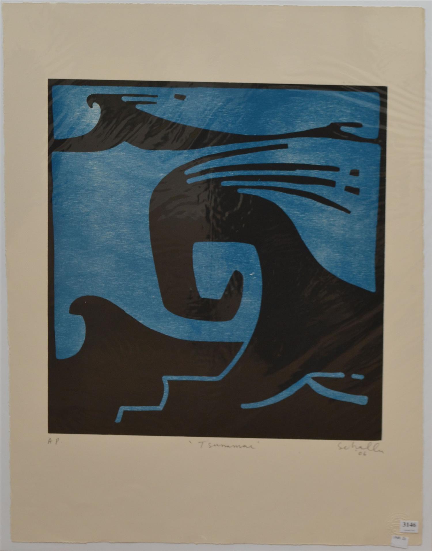 MARK SCHALLER, TSUNAMAI 2006, WOODBLOCK A/P, 76 X 56CM (SHEET SIZE), CONDITION: VERY GOOD, UNFRAMED, HOWEVER BACKED AND WRAPPED IN PLASTIC FOR PROTECTION