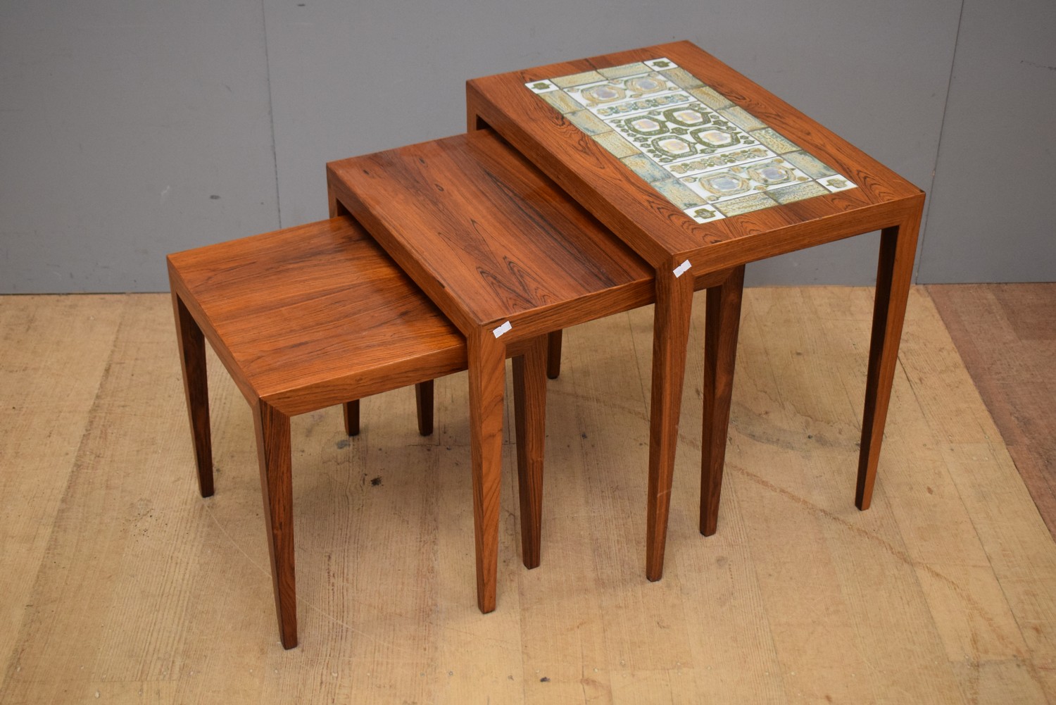 A NEST OF THREE MID-CENTURY DANISH ROSEWOOD COFFEE TABLES WITH TILED TOP TO LARGEST (50H X 57W X 37D CM)