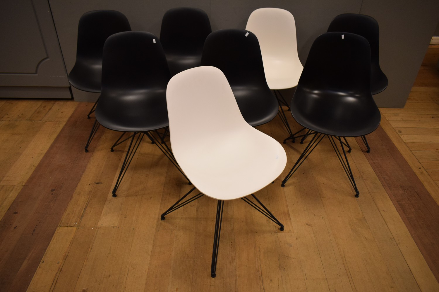 A SET OF EIGHT MID CENTURY STYLE DINING CHAIRS, SIX BLACK AND TWO WHITE (83 CM H)