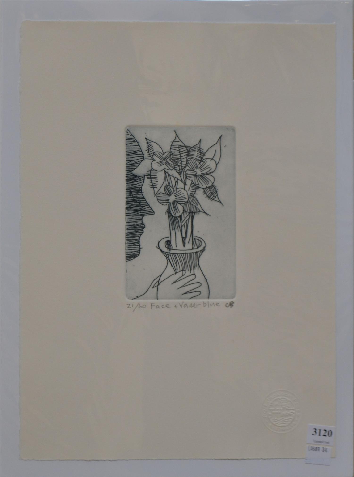 CHARLES BLACKMAN, FACE + VASE - BLUE, ETCHING 21/60, 38 X 28CM (SHEET SIZE), CONDITION: VERY GOOD, UNFRAMED, HOWEVER BACKED AND WRAPPED IN PLASTIC FOR PROTECTION