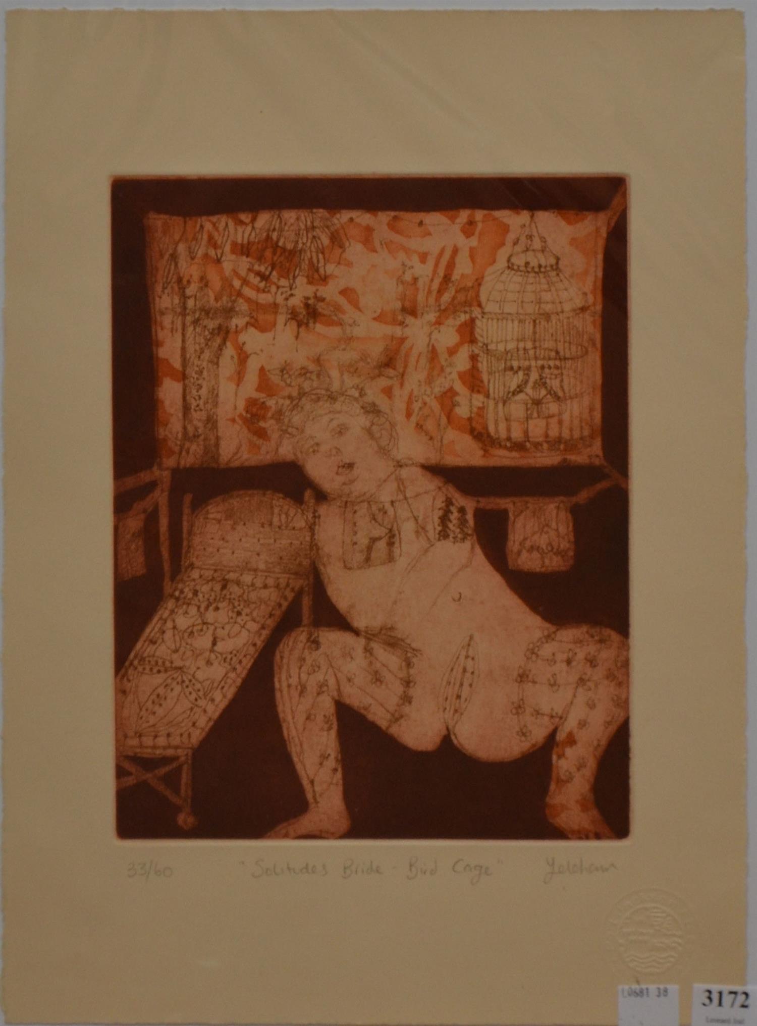 JOHN YELDHAM, SOLITUDE'S BRIDE - BIRD CAGE, ETCHING 33/60, 38 X 28CM (SHEET SIZE), CONDITION: VERY GOOD, UNFRAMED, HOWEVER BACKED AND WRAPPED IN PLASTIC FOR PROTECTION