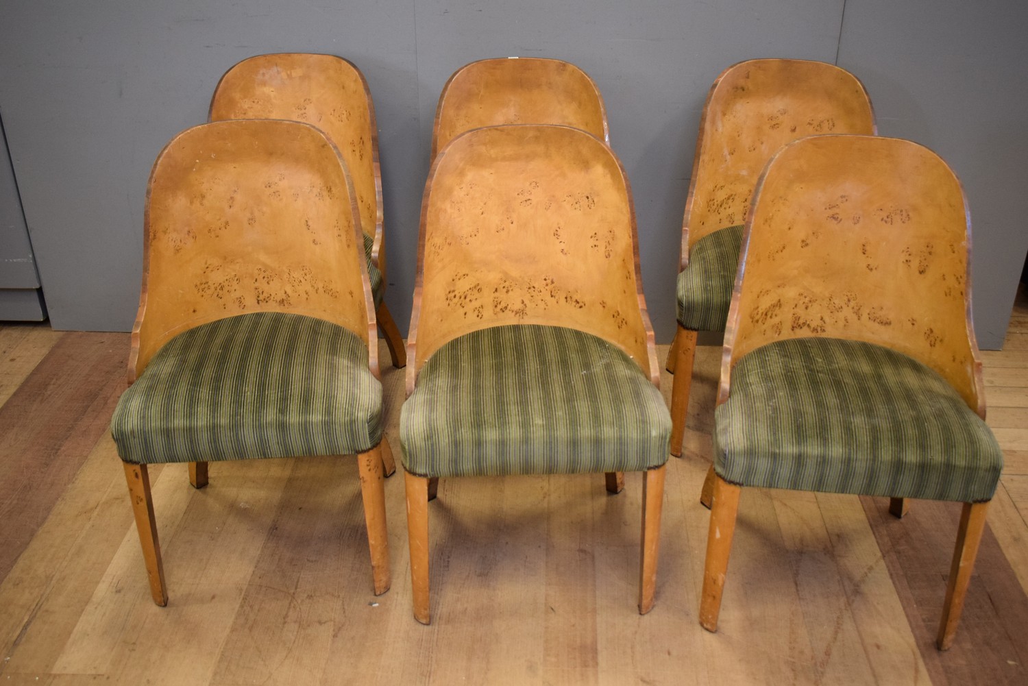 A SET OF SIX ART DECO BURR ELM UPHOLSTERED TUB CHAIRS, CIRCA 1935 (89H X 52W X 52D CM) (A/F)