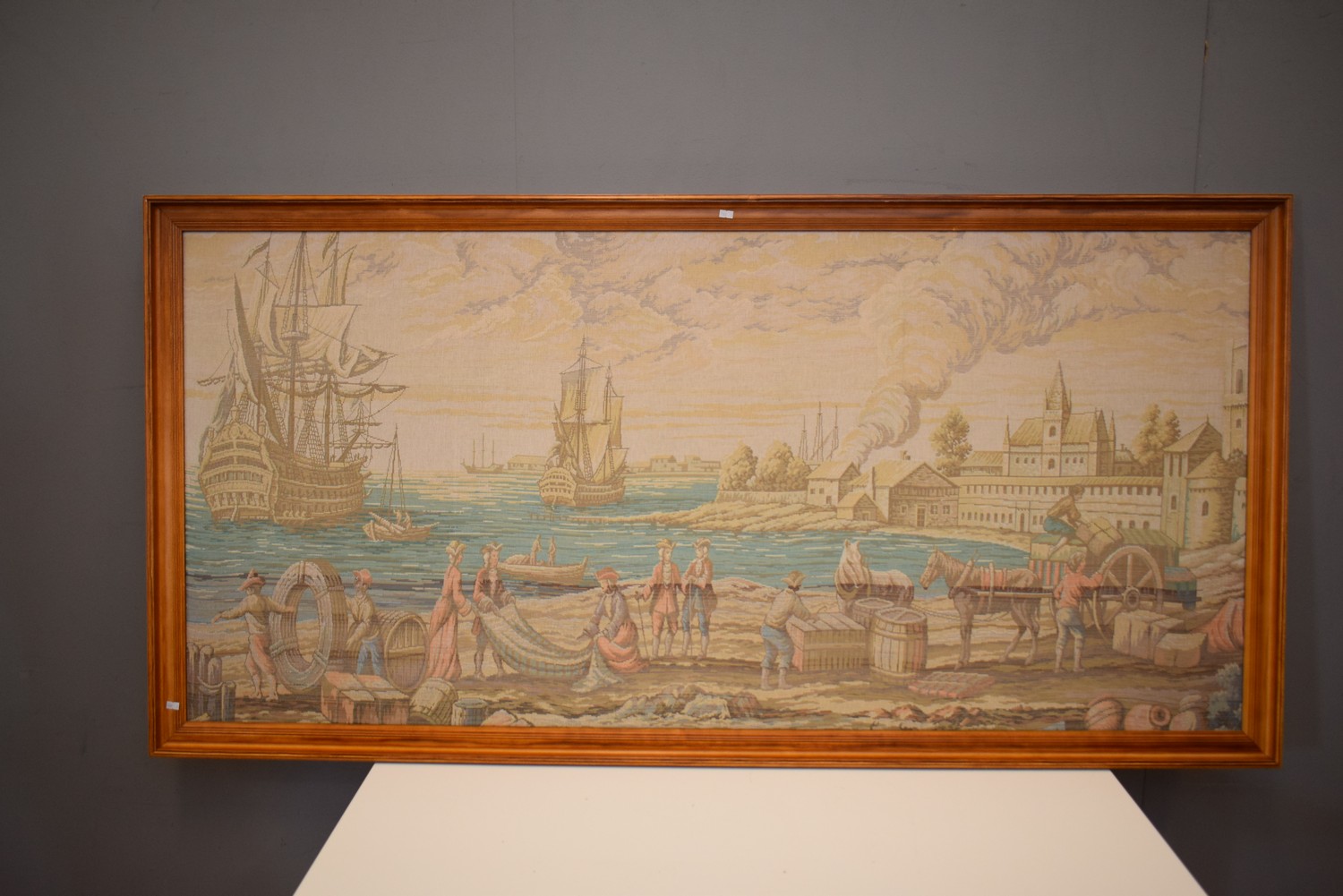 A LARGE FRAMED TAPESTRY DEPICTING A PORT SCENE (93H X 186W CM)