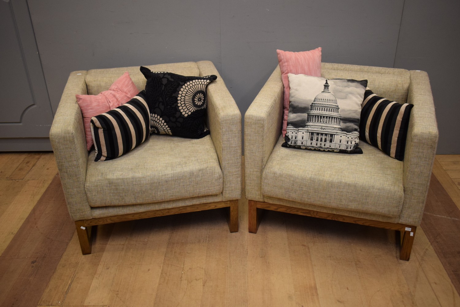 A PAIR OF UPHOLSTERED ARMCHAIRS WITH SIX CUSHIONS (72H X 87W X 85D CM)