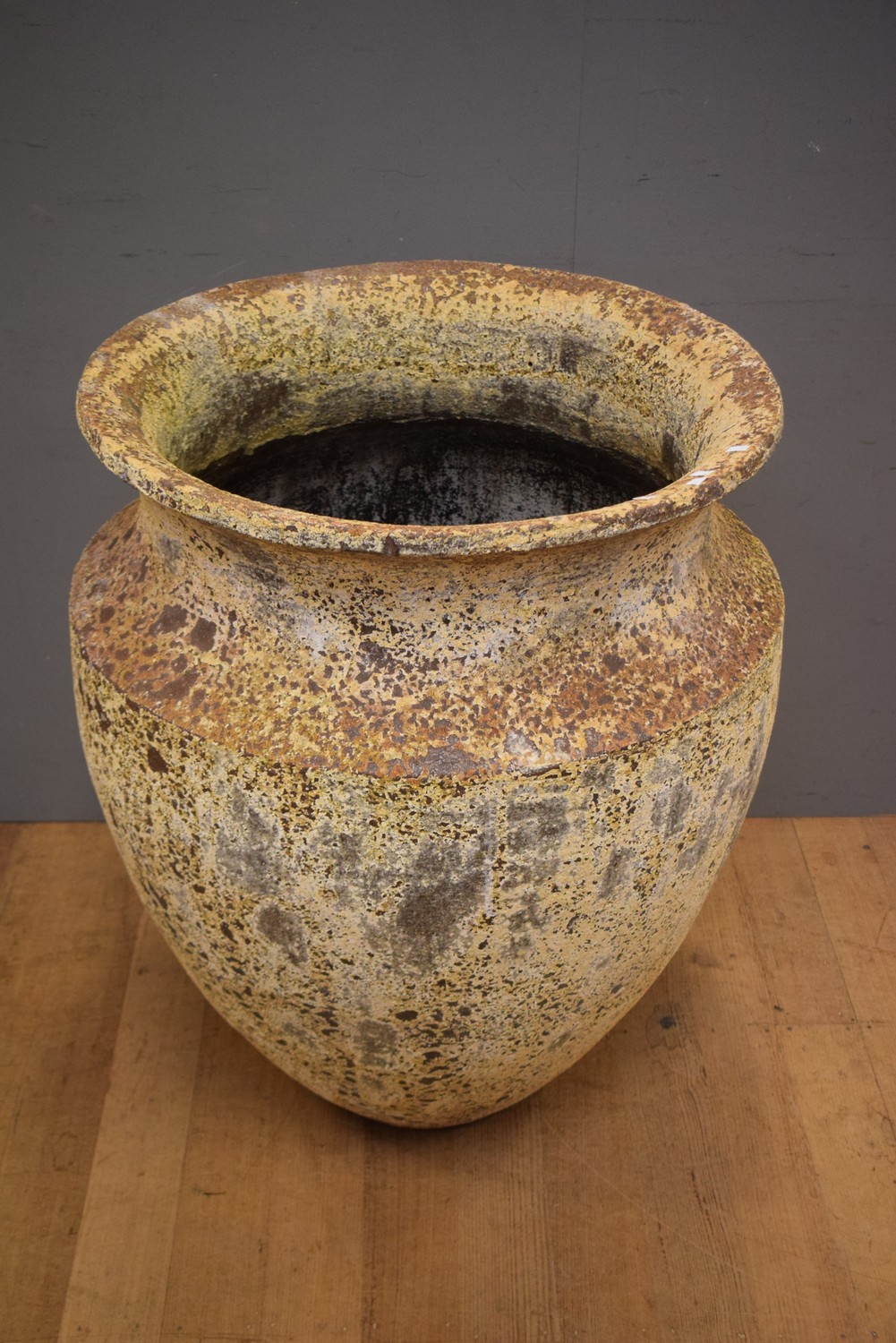 A VERY LARGE AND IMPRESSIVE METAL PLANTER (91H X 80D CM) (PLEASE NOTE THIS ITEM MUST BE REMOVED BY CLIENTS OR CARRIERS AT THE CUSTOMERS EXPENSE)