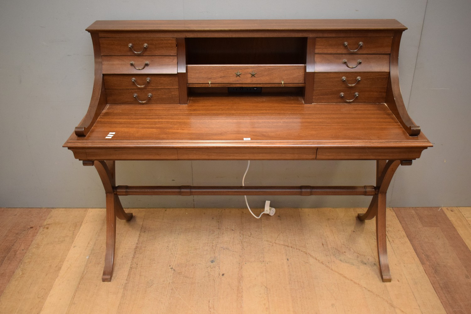 A TIMBER LADIES DESK WITH STRETCHER BASE BY MARC FRENCH (107H X 140W X 57D CM)