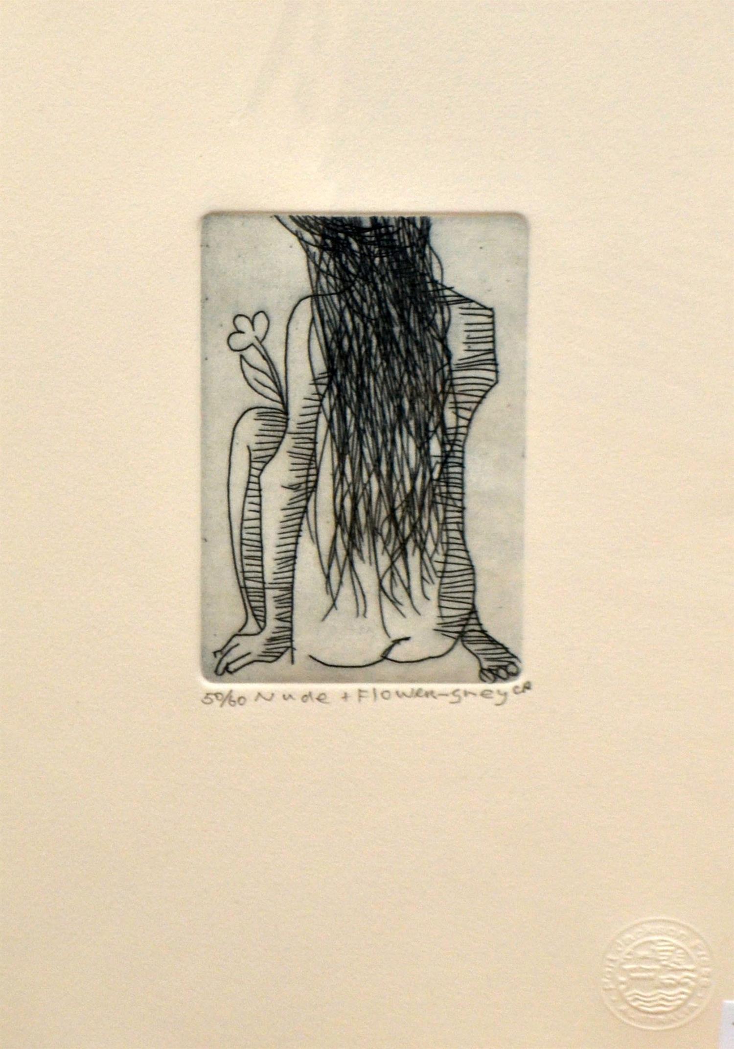 CHARLES BLACKMAN, NUDE + FLOWER - GREY, ETCHING 50/60, 38 X 28CM (SHEET SIZE), CONDITION: VERY GOOD, UNFRAMED BUT BACKED AND WRAPPED IN PLASTIC FOR PROTECTION