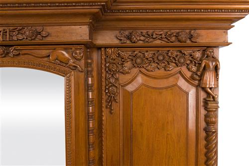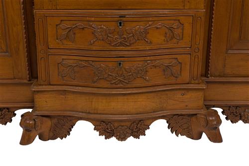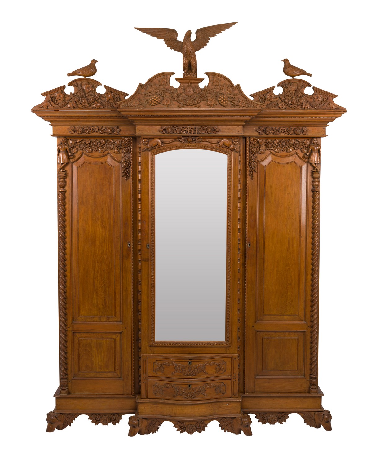 The solid teak wardrobe elaborately carved with flowers, foliage, human figures, cats and dogs. The whole surmounted by a central eagle with outstretched wings, flanked by two doves, all with coral inset eyes.