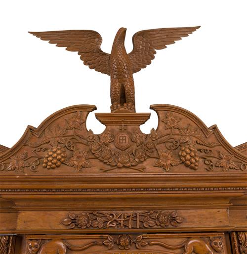 repair to one wing on central eagle finial. General wear and losses overall consistent with age and use. The central door opening to a pendant coat rack- repaired.