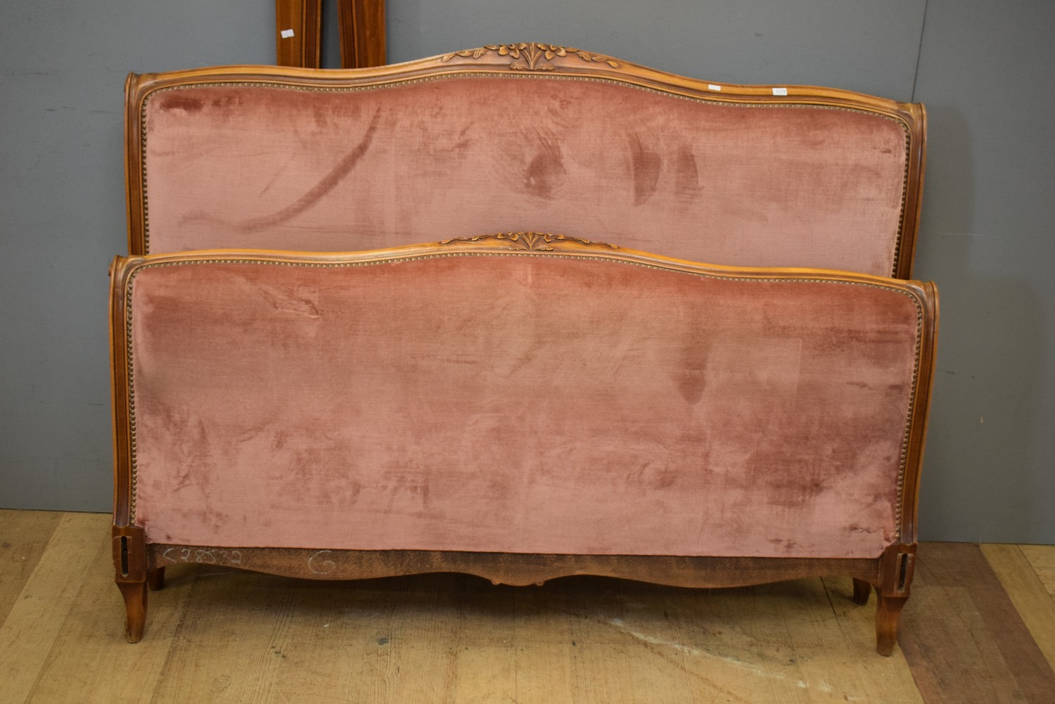 A LOUIS XV STYLE UPHOLSTERED DOUBLE BED WITH RAILS (HEAD 105H X 150W CM)