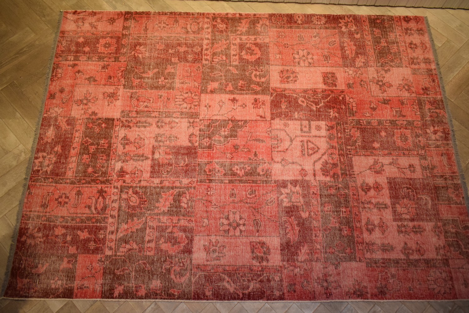 A VINTAGE OVERDYED TURKSIH RUG, HANDMADE IN PURE WOOL WITH ALL OVER GEOMETRIC DESIGN, 369 X 281 CM