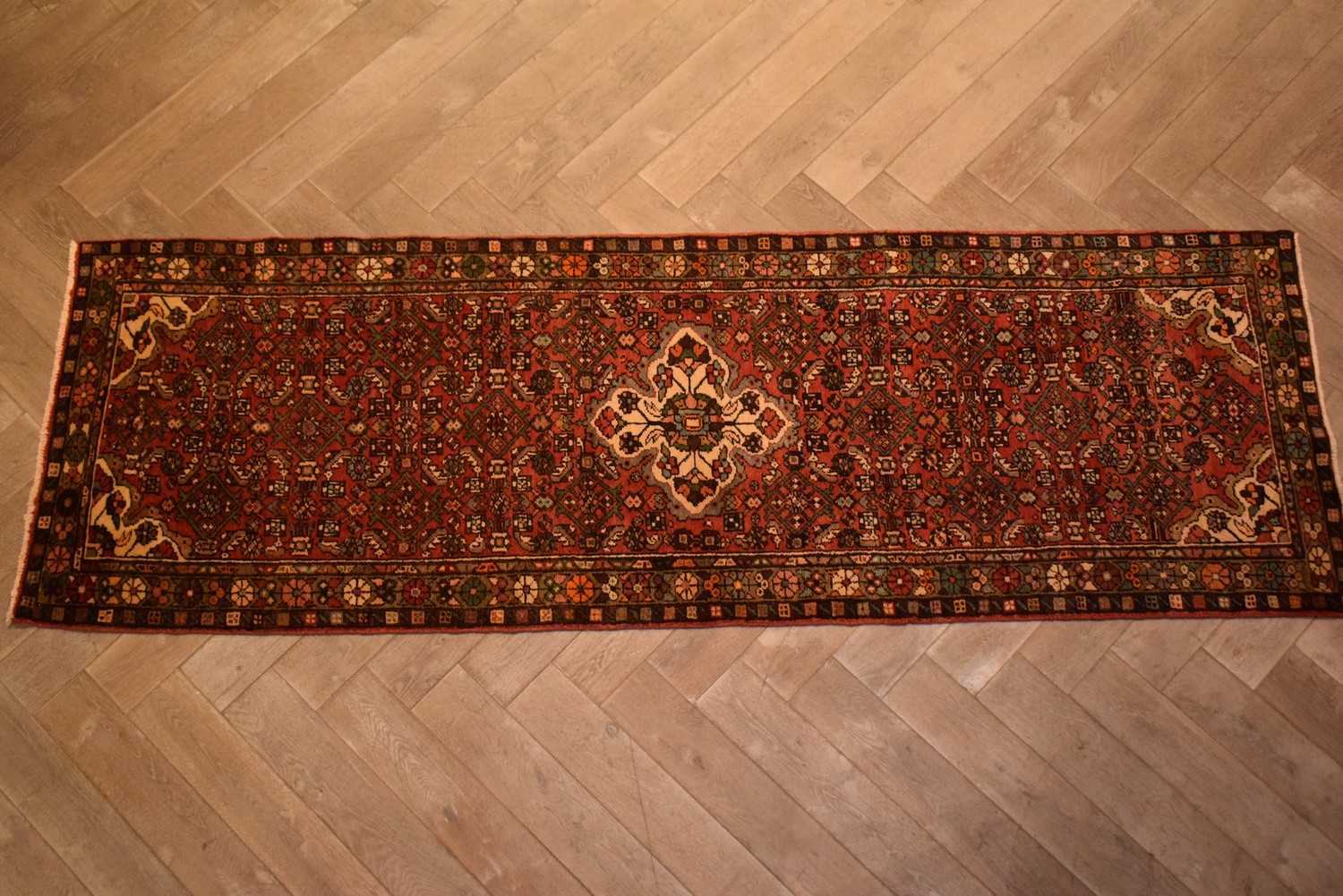 A PERSIAN ENJELAS HALL RUNNER. 100% WOOL. DENSE PILE. SOLID & HARD-WEARING. EX-GALLERY STOCK. IN EXCELLENT CONDITION. HAND-KNOTTED VILLAGE WEAVE FROM THE HAMADAN REGION WITH TRIBAL DESIGN OF FLORAL MEDALLION AND CORNER MEDALLIONS IN A RED FIELD OF BOLD HERATI MAHI PATTERN. BORDER OF FLOWER HEADS. CERTIFICATE OF AUTHENTICITY INCLUDED. SIZE: 310X102CM, ORIGIN: PERSIA – RRP: $2,200