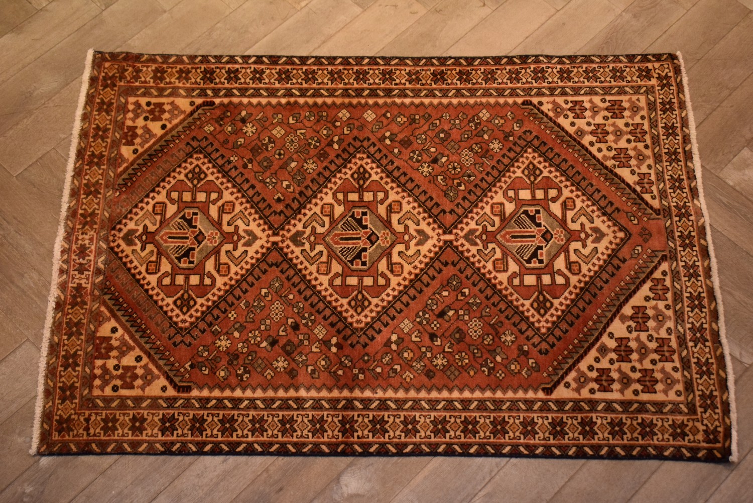 A TRIBAL PERSIAN HAMADAN RUG WITH TRIPLE BOLD MEDALLION DESIGN. 100% WOOL. SIZE: 191X135CM, ORIGIN: PERSIA