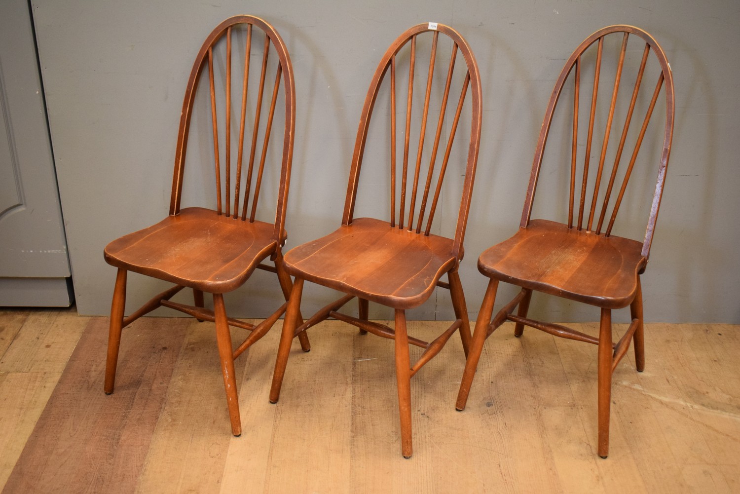 A SET OF THREE SPINDLE BACK DINING CHAIRS (101 CM H)