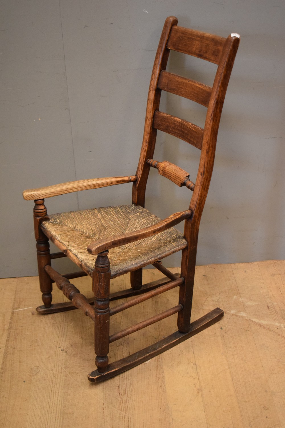 A BRUSH SEAT LADDERBACK ROCKING CHAIR (100 CM H)