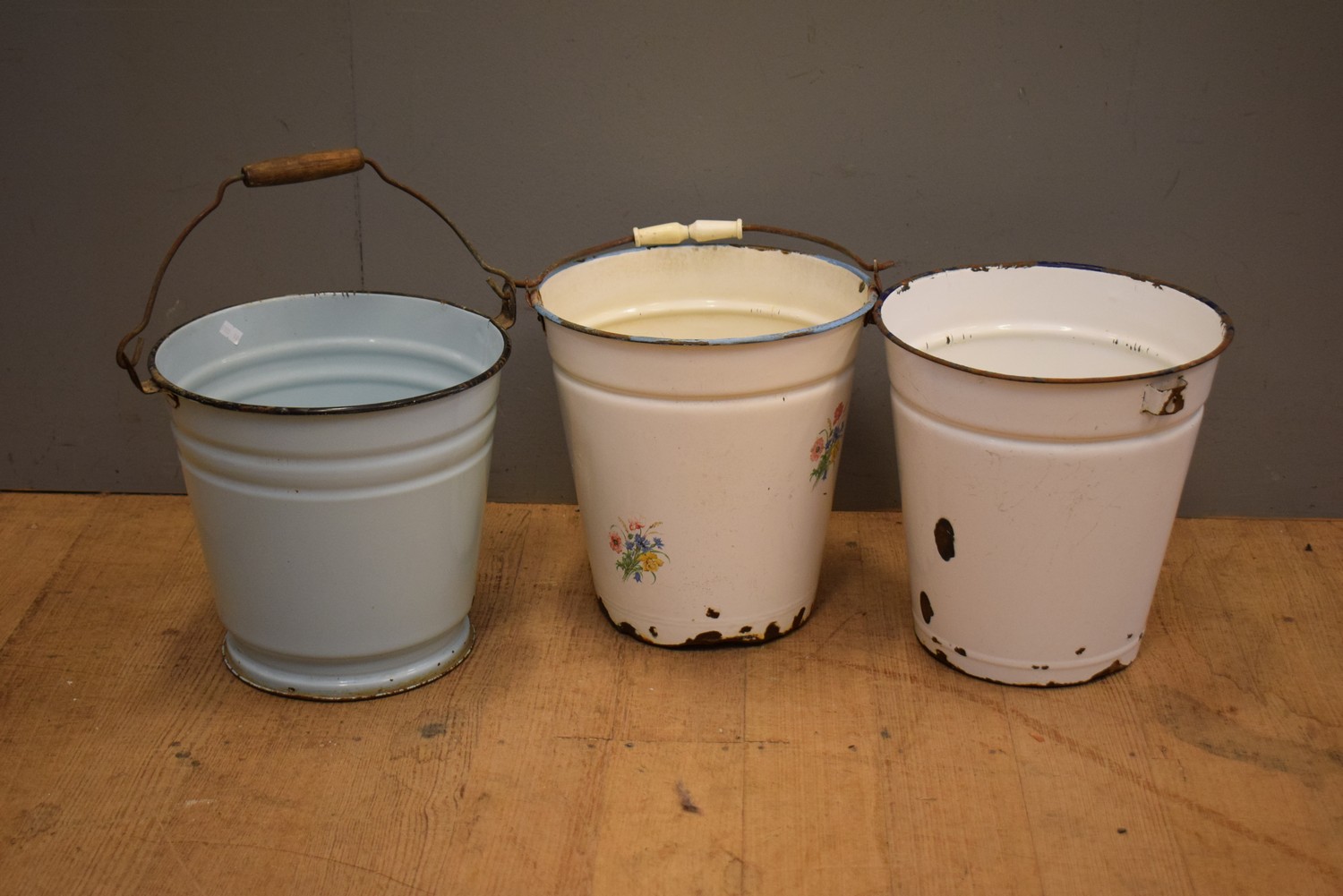 A COLLECTION OF THREE 1900S FRENCH ENAMEL BUCKETS, TWO WHITE AND ONE BLUE (30H X 29D CM)