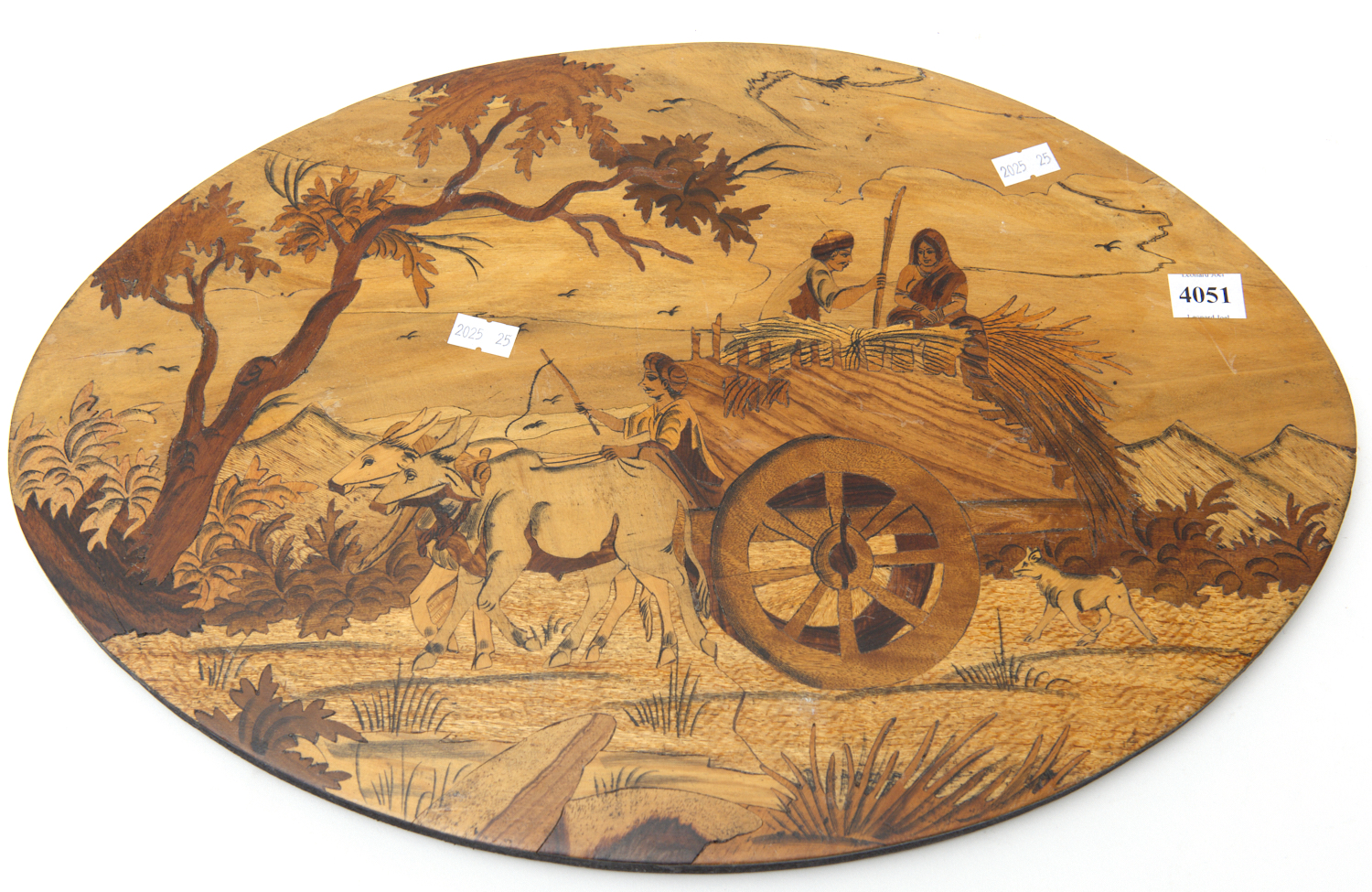 1900S INLAID WOODEN PLAQUE WITH COW AND CART SCENE