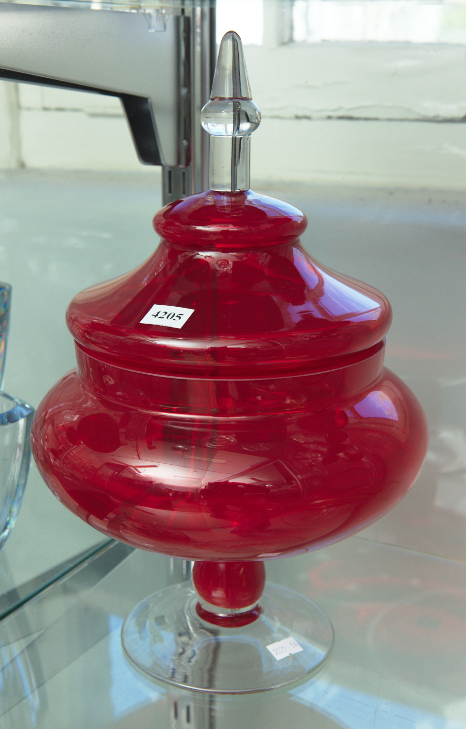 LARGE 1960S ITALIAN RED GLASS LIDDED PEDESTAL BOWL