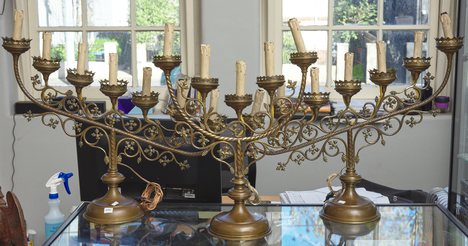 RARE SET OF THREE 19TH CENTURY BRASS CHURCH CANDELABRAS - ELECTRIFIED IN THE 1920S CONSISTING OF TWO X SEVEN AND ONE X FOUR SCONCE
