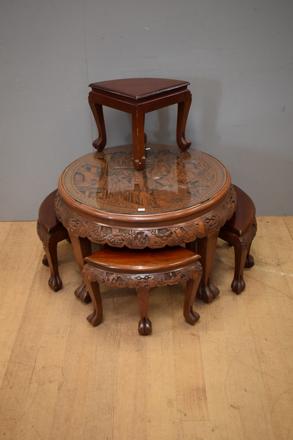 A CHINESE DECORATIVELY CARVED COFFEE TABLE WITH FOUR SIDE TABLES (COFFEE TABLE 50H X 80D CM)