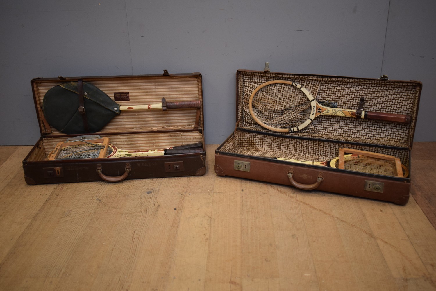 A COLLECTION OF VINTAGE TENNIS RACKETS IN CASES (15H X 75W X 29D CM)