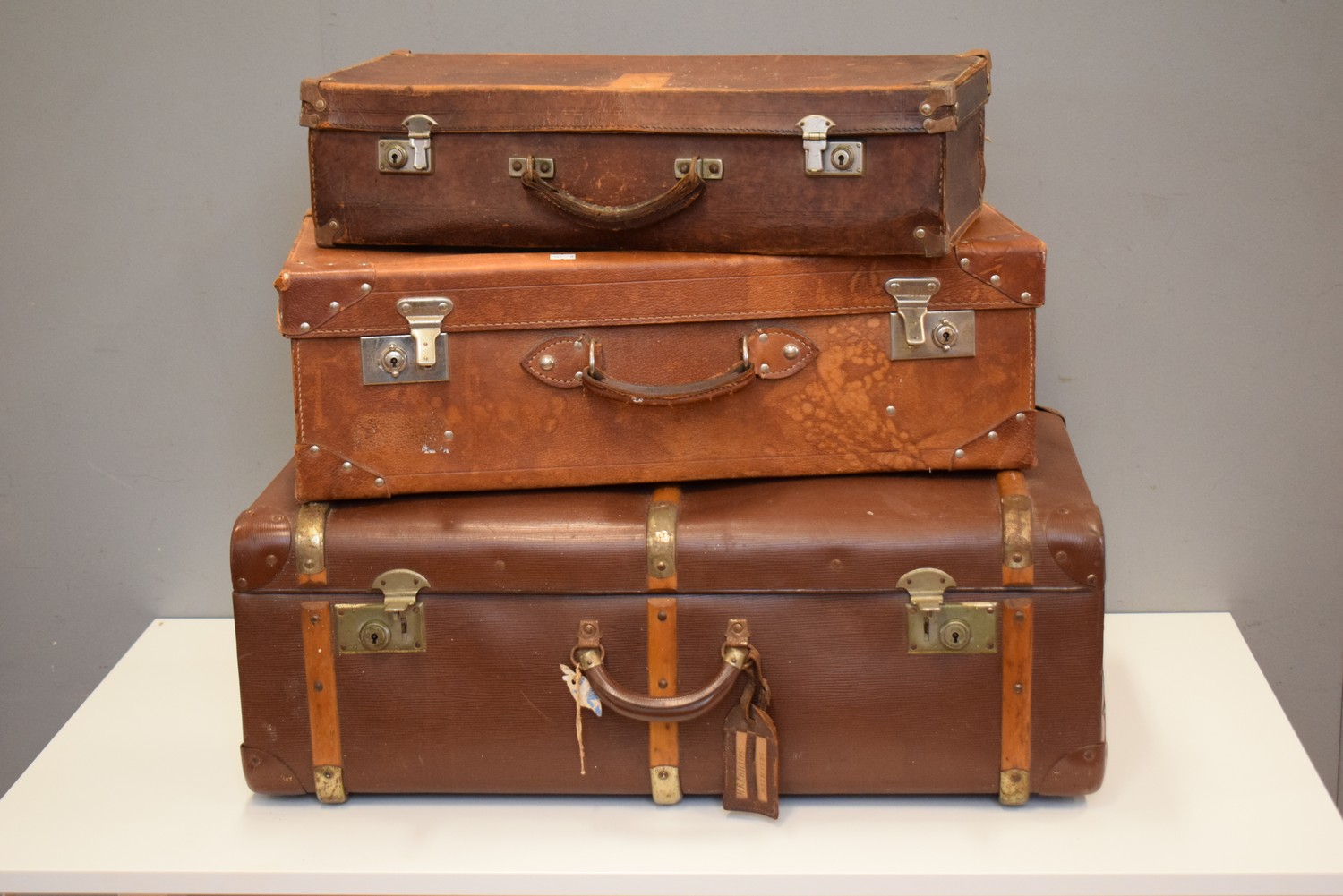 A COLLECTION OF THREE LEATHER SUITCASES (28H X 76W X 44D CM)
