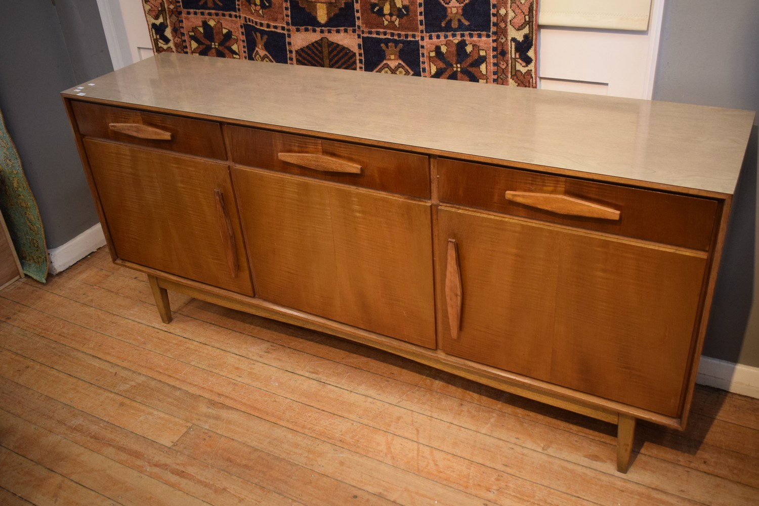 A MID-CENTURY THREE DOOR BUFFET (90H X 193W X 48D CM)