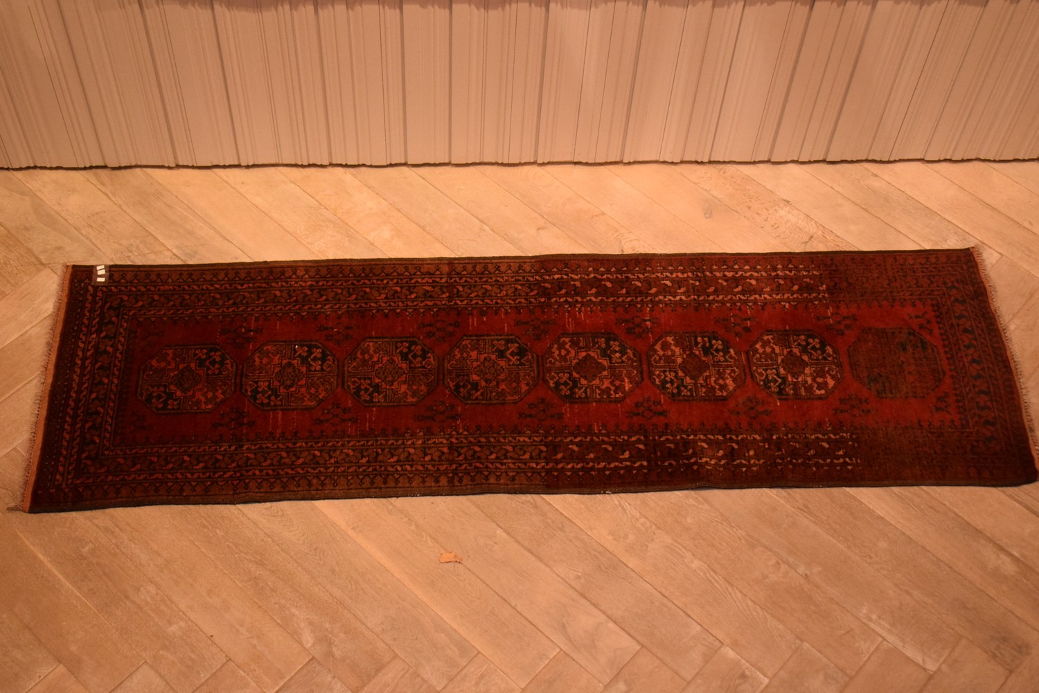 AN AFGHAN RUNNER IN RED TONES WITH ELEPHANT FOOT DESIGN (80 X 290 CM)
