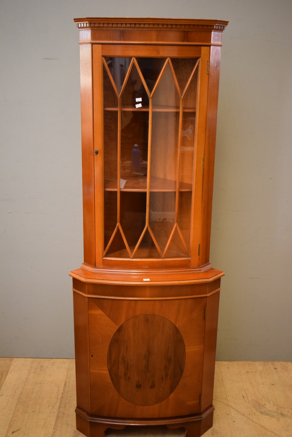 A DECORATIVELY INLAID ENGLISH MADE GEORGIAN STYLE CORNER CABINET (181H X 67W X 50D CM)